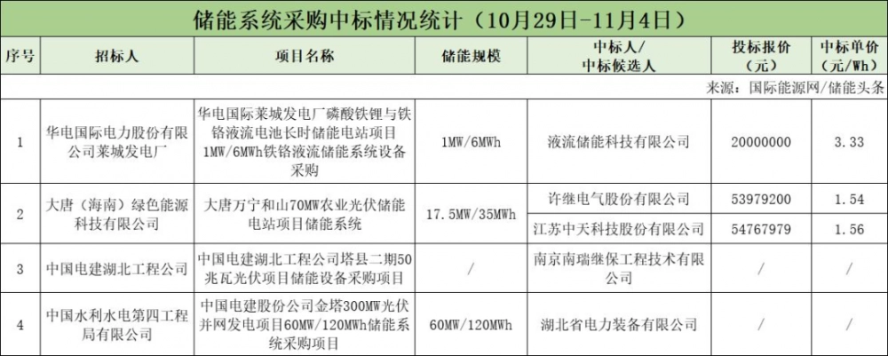 4個儲能采購中標項目,中標單價1.54-3.33元/Wh