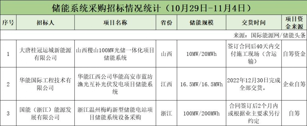 據了解統計,本周大唐集團、華能集團、國家能源集團等企業發布了3個儲能采購招標項目,招標規模為126.5MW/236.5MWh。項目位于山西、江西、浙江等地。