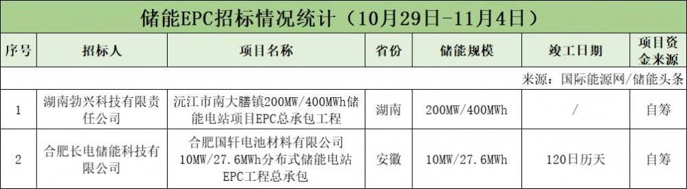 據了解統計,本周湖南勃興科技有限責任公司、合肥長電儲能科技有限公司等企業發布了2個儲能EPC招標項目,招標規模為210MW/427.6MWh。項目位于湖南、安徽等地。